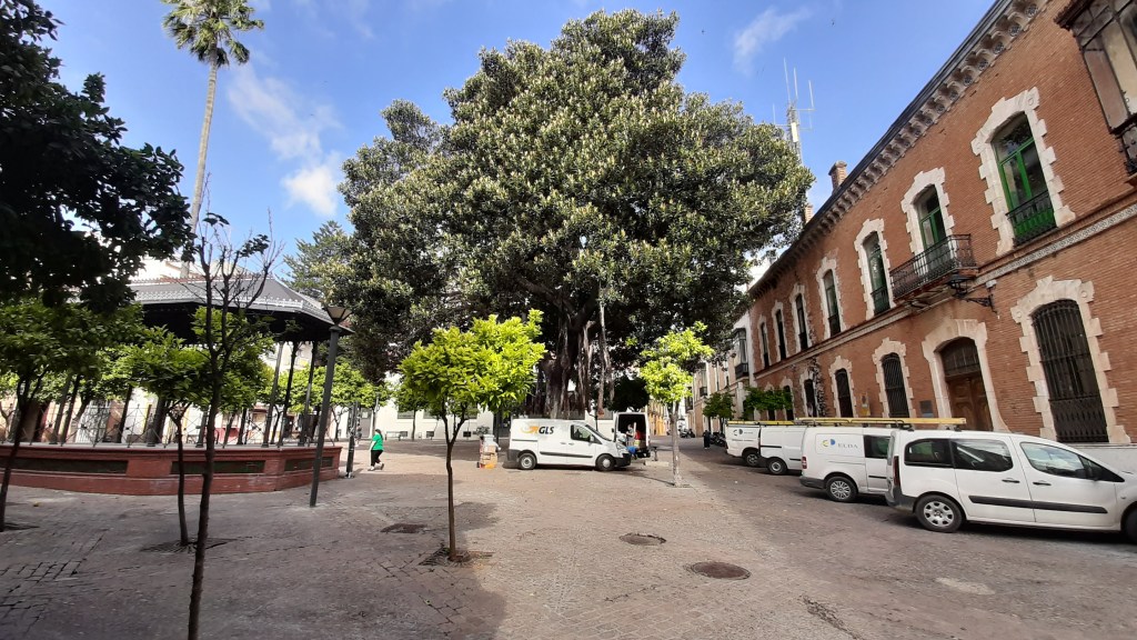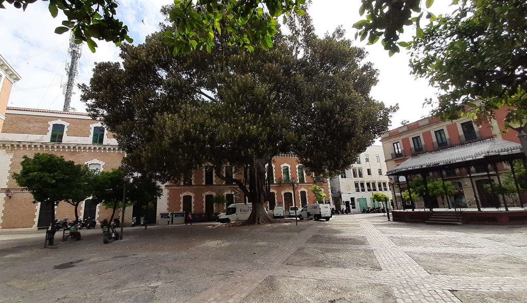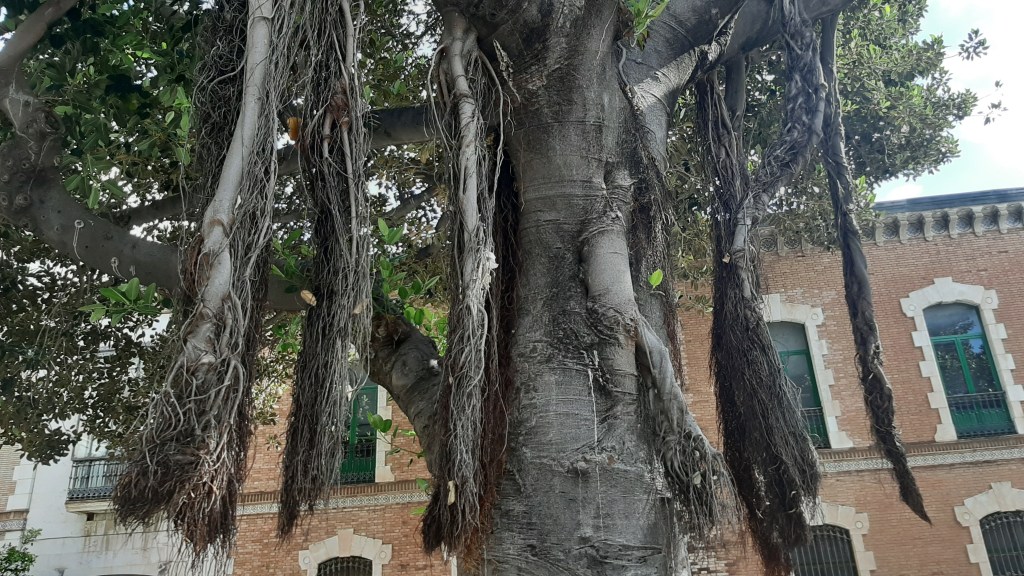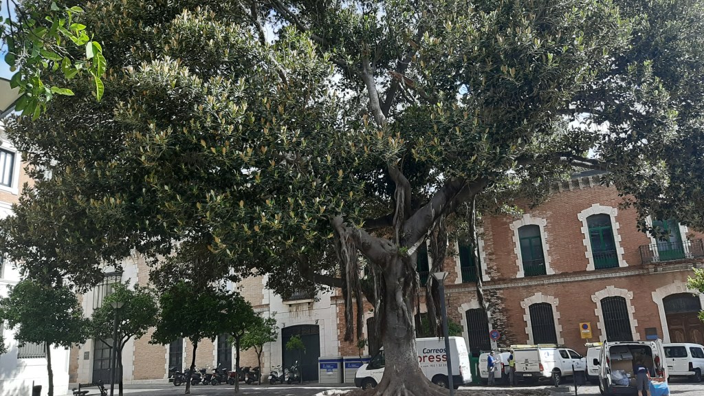 A través de la calle Larga llegamos a la Plaza del Banco, antigua General Primo de Ribera donde pude admirar un ejemplar esplendoroso de Ficus rubiginosa, comúnmente Ficus oxidado que se caracteriza por la producción de raíces aéreas y por el color ferruginoso del envés de las hojas.