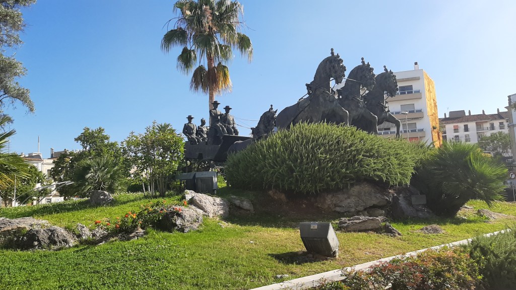 Al seguir por la Avda. nos encontramos la Plaza del Caballo, nombrada así como homenaje al caballo jerezano, se erigió este monumento inaugurado el 30 de 0ctubre de 1970, obra del escultor Antonio Navarro Santafé, que representa a un caballo y una yegua en bronce sobre un montículo ajardinado, el artista era muy reconocido por ser el autor de la Estatua del Oso y el Madroño situada en la Puerta del Sol de Madrid.