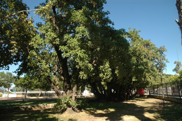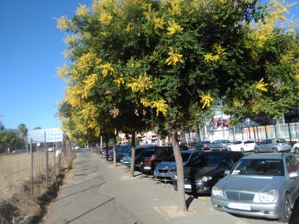 Tipuana tipu. Acacia tipuana.–La introducción de las Tipuanas en la ciudad se inició con las plantaciones del Paseo de Colon 1962 y arcenes de la Avda. Eduardo Dato frente el Campo del Sevilla C.F en 1964,a la vez se plantaban en los Jardines de Chapina. Un error fue plantarlas en estas mismas fechas en la calle San Jacinto, el desarrollo del árbol es totalmente inadecuado a la anchura de la acera, Con posterioridad a esta fechas se han plantado en muchas Avda. Alcalde Manuel del Valle 1985,Ronda del Tamarguillo,1980.-85,Calle Monzón 1965-70,Jardines del Prado de San Sebastian.1996-1997,Avda. Poeta Manuel Benítez Carrasco 1998-2000, Avda. de la Paz 1998-2000,Polígono Sevilla-Este etc.…