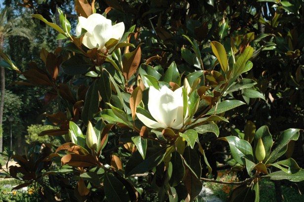 Magnolia grandiflora.-Magnolio.-El más antiguo en los Reales Alcázares.-Jardin de la Danza 1890-1900.en el Parque de María Luisa la Avda. Rodrigue Caso 1920.Magnolias Plaza de la Magdalena 1998-2000,Magnolio de la Catedral 1948.- Magnolias en el Rectorado de la Universidad.sin datar.