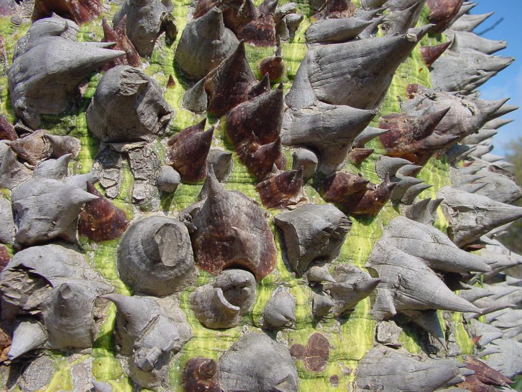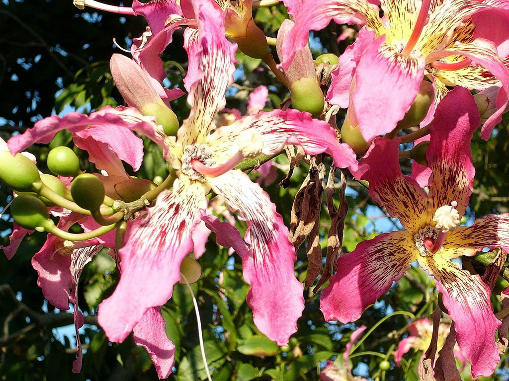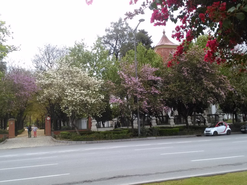 Ceiba speciosa.-Palo Borracho.-El más antiguo en de los Reales Alcázares junto al Estanque del León, Según Joaquín Romero Murube fue regalado por una inglesa allá por el año 1948,hijos de este se encuentran plantados en otros jardines del Alcázar. Unos buenos ejemplares en el Parque del Alamillo junto al aparcamiento 1996 .En la confluencia de la Avda. de la Mujer Trabajadora y Alcalde Manuel del Valle hay unas Ceiba insignis de flor amarilla 2005.En el Parque de los Príncipes una 2000,,en la glorieta de tráfico frente al Centro Andaluz del Deporte Expo.-1990.No son plantadas en calles por sus espinas en los troncos.