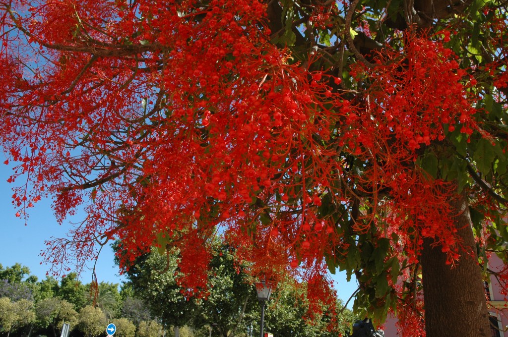 Erythrina crista galli.-Arbol del Coral.-Su principal exponente estaba en la entrada del Hotel Alfonso XIII desde su construcción, qué con grandes pudriciones en su tronco derribo un vendaval. Detrás de esta hay una nueva plantada en 1990.En los jardines de la Maestranza ocurrió un caso similar ,el tronco está rebrotando. Se han plantado nuevas en el Parque Guadaira II en el 2004-06.