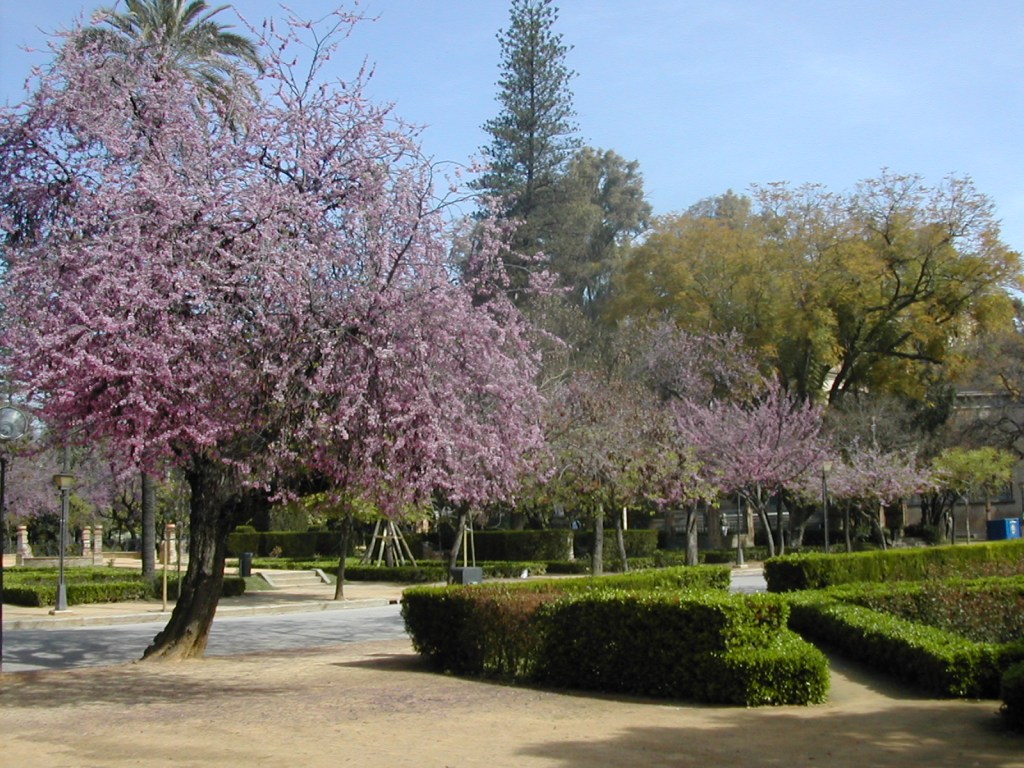 Cercis siliquastrum.-.-Arbol del amor.– Parque María Luisa entorno Plaza de América y Pabellón Real..-Reitero que cuando llegue a Sevilla allá por el 1956 los Cercis ya estaban plantados en la Plaza, los más antiguos se les pueden datar como fecha de plantación 1949.1950 plantados en una reforma de la rosaleda de la Plaza de América. La especie es muy longeva. La plantación se realizaría en la época de Fernando Ibarrola como concejal de Parques y Jardines.