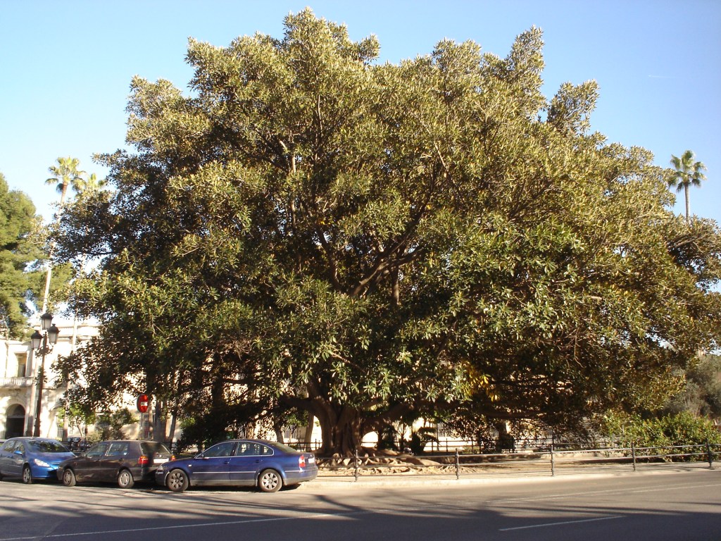 Ficus microcarpa.-Laurel de Indias, originario de Asia y Oceanía, se distingue por las pequeñas hojas e higos que expone; en la plaza de La Encarnación,1950 el singular de la Plaza San Leandro,, el más corpulento en los Jardines de San Telmo 1929 y los plantados en la calle Torneo en 1990 , los de la plaza San Francisco arquitecturizados.-1974.- en Plaza de Chapina 1980,en Parque Magallanes, trasplantados desde el Paseo Marques del Contadero 1988.Un magnifico ejemplar en el Parque Rectora Rosario Valpuesta ( antigua Pirotecnia ) sin datar, en el Parque de Miraflores uno trasplantado desde la Plaza de la Encarnación al ser tumbado por un vendaval 1985.-87,En la Expo 92 se plantaron en la estación de Telecabinas de calle Torneo sin olvidar dos ejemplares a la entrada del Parque de María Luisa,.1950.