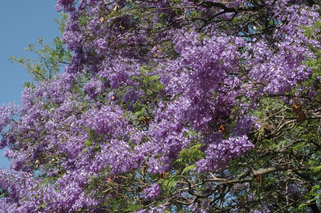 Jacaranda mimosifolia.-Jacarandá.-En el Paseo de Colon se plantaron en 1962.Existian ya en los Jardines de la Lonja, Cristina y Plaza de América en ejemplares aislados,, no en las calles de la ciudad, donde se introdujeron en los ajardinamientos del Paseo de Colon y la Avda. Eduardo Dato 1962-64., en 1970 se plantaron en el Parque de los Príncipes donde están muy representadas, les siguieron la calle Luis Montoto .la Glorieta Juan de Austria y la Avda. Ramon y Cajal en 1985-1988 ,en la Avda. de María Luisa sustituyeron a unas vetustas acacias negras en el 1990-1992 y con posterioridad en la Avda. Ramon Carande y otras.