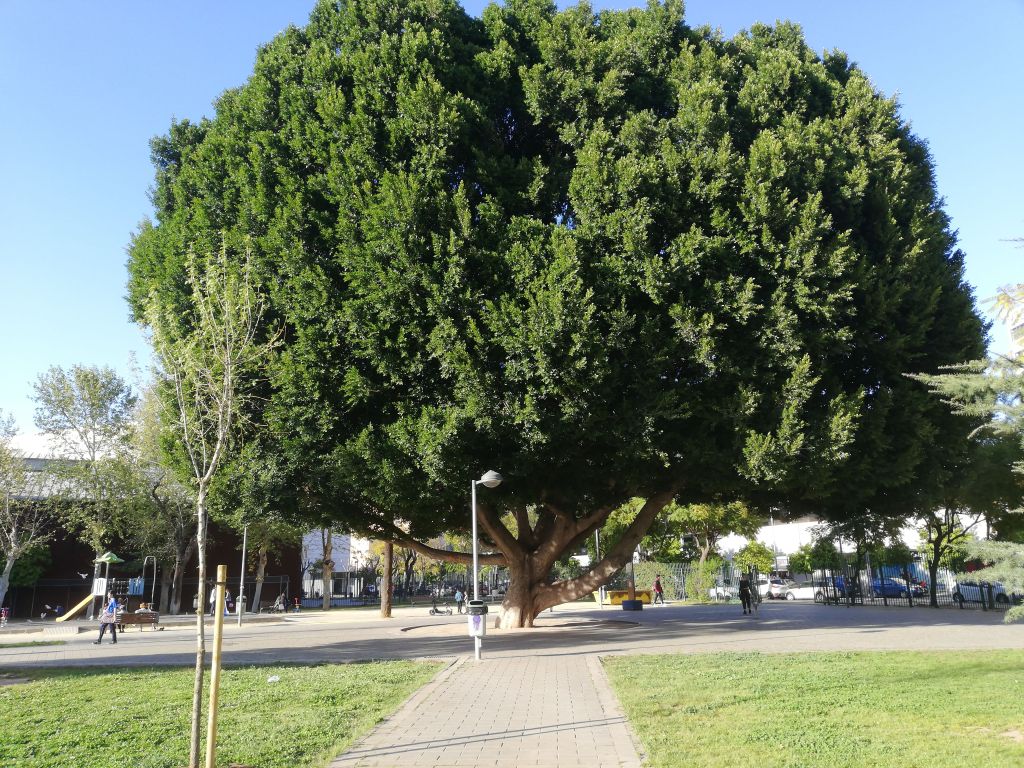 Ficus macrophylla.- Ficus o Higuera de Moretón.-Situación en los Jardines de la ciudad.-Muy representado en el Parque de María Luisa con ejemplares centenarios, .en el Parque de los Príncipes de 47 años ,en Plaza Cristo de Burgos casi centenarios,1945 en Jardines de Murillo centenarios 1911,un buen ejemplar de cerca de 50 años en calle Palos de la Frontera. Mas viejos ejemplares en la Plaza del Museo, en la Iglesia de San Jacinto en la calle Pages del Corro que un fraile dominico lo trajo en el 1913 de Puerto Rico a Triana, en los Jardines del Parlamento, este trasplantado desde la Plaza de la Concordia en 1980 al construirse el aparcamiento subterráneo del Corte Inglés, etc.… además en varios jardines privados.