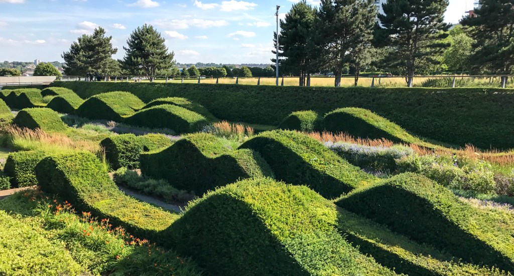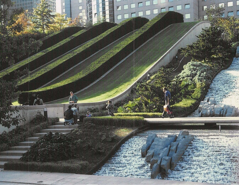 El parque tiene un aspecto moderno y fresco con plantaciones aventureras y una fuente de aguas danzantes. En el plan, el diseño tiene una clara semejanza con el esquema ganador de la competencia de Alain Provost para Parc Citroen en París. Ambos planes están dominados por una línea diagonal que corta un rectángulo. Esta idea geométrica se encuentra en muchos de los diseños de paisajes de Provost, y se vio por primera vez en la nueva ciudad francesa de Cergy-Pontoise (donde Derek Lovejoy y Partners eran los arquitectos paisajistas, en asociación con Alain Provost).