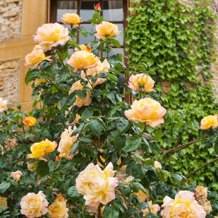 En palabras de Peter Beale, un destacado experto en rosas inglesas, «‘Peace’, sin duda, es el mejor té híbrido jamás criado y seguirá siendo una variedad estándar para siempre». Y para mí descubrir que también viene en forma de escalada, fue la guinda del pastel. La rosa de la paz es un té híbrido con flores grandes de color amarillo claro a crema, ligeramente enrojecidas en los bordes de los pétalos con rosa carmesí. Es resistente y vigoroso y relativamente resistente a las enfermedades, lo que la hizo popular tanto en jardines como en el comercio de flores. Y desde hace 83 años en un mes de junio cuando fue creada ha sido la protagonista en muchos en nuestros jardines .