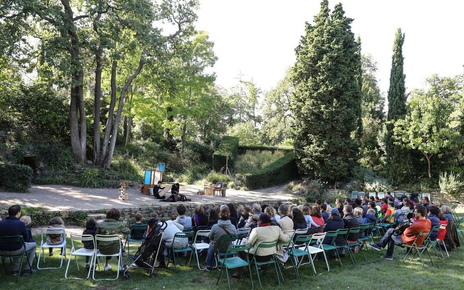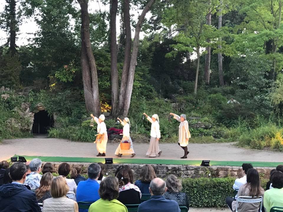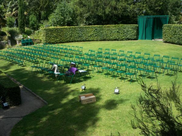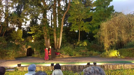 Las arboledas que bordean la entrada al anfiteatro recuerdan a Arden Forest al norte de Stratford-Upon-Avon, donde tiene lugar la acción de As You Like It. También se mencionan los páramos y brezales escoceses de las brujas de Macbeth, las plantas mediterráneas de la tormenta, la madera griega del sueño de una noche de verano, en el fondo sobre el escenario. Finalmente, una cascada y la corriente «murmurante» hacen eco del triste destino de Ophélie de ‘Hamlet. El conjunto conserva los viejos árboles, cubre un área de 3000m2 y puede albergar a 500 espectadores.