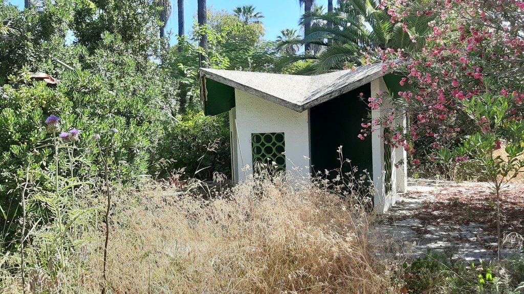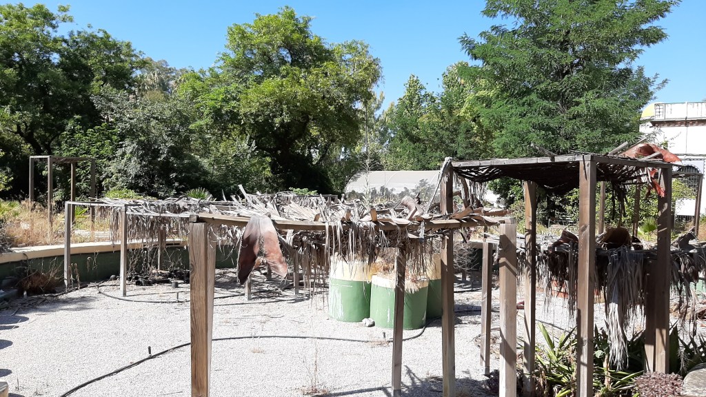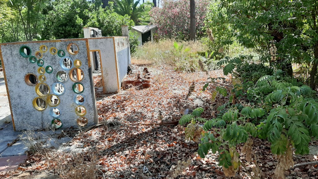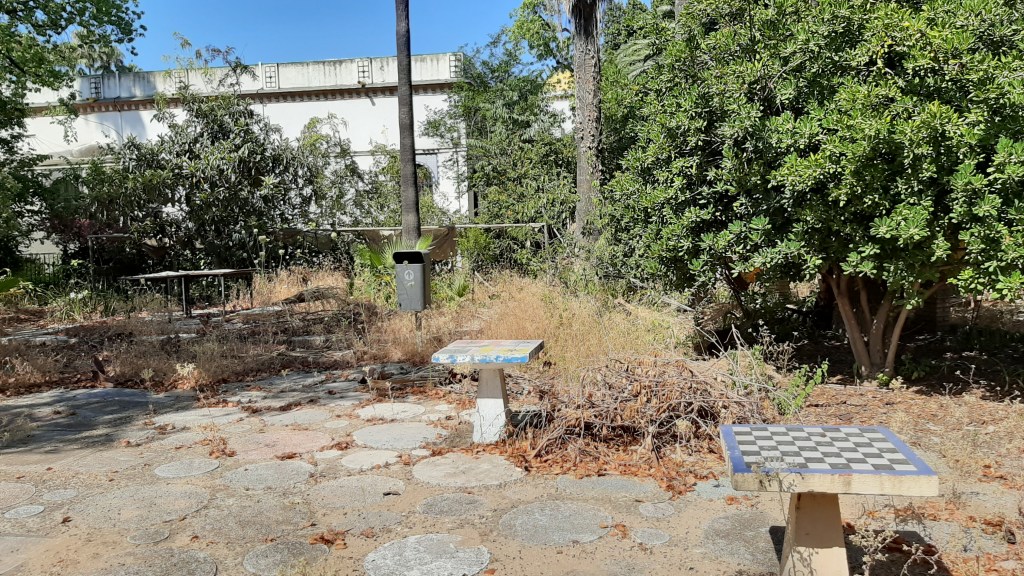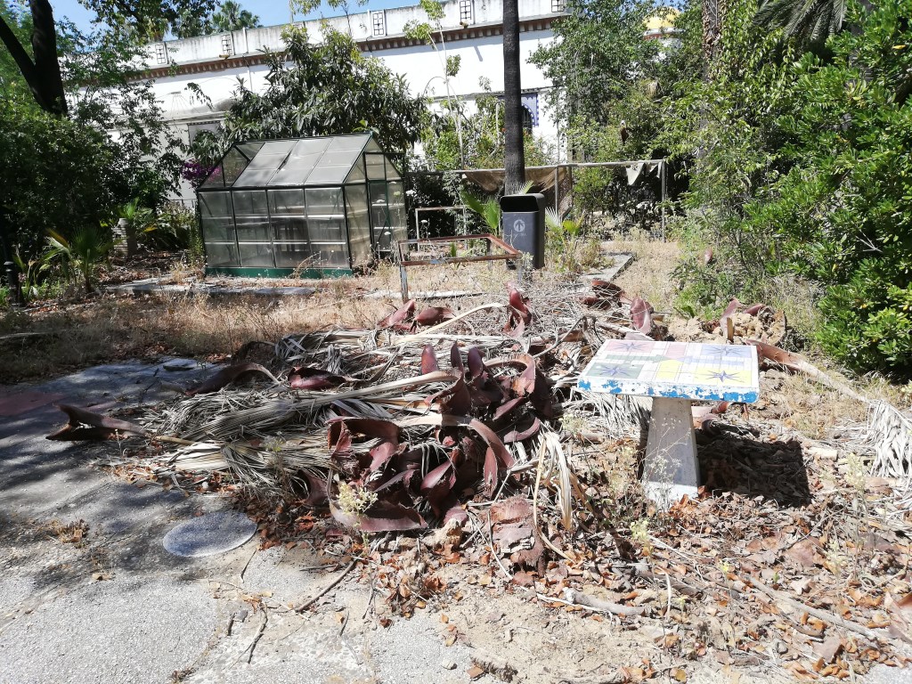 El Pabellón que albergaba la escuela con las obras realizadas sigue cerrado, en lo que era la biblioteca se ha hundido el techo, unas profesoras están manteniendo voluntariamente el jardín delantero del edificio pero se les escapa realizarlo en lo que era el jardín experimental de prácticas de la escuela conocido antiguamente como el Jardin Blancanieves de propiedad municipal al igual que el pabellón cedido para la escuela .La conservación de este campo experimental y de practicas la realizaron algunos alumnos y voluntarios algún tiempo, pero en la actualidad y desde hace años en el más completo abandono ,han desaparecido los caminos invadidos por la maleza y los restos secos de vegetación de palmeras y podas efectuadas distribuidos por todo el recinto son un peligro evidente de incendio, como se denunció hace un año y como lo muestran las fotografías que se acompañan al artículo.