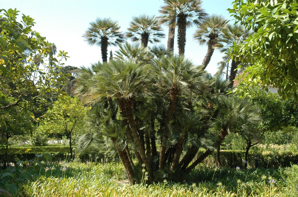 Chamaerops humilis, la única especie del género Chamaerops, se conoce popularmente como palmito o palmera enana. Es una de las dos especies, junto con Phoenix theophrasti, de la familia de las palmeras nativa de la Europa meridional. Se distribuye por el norte de África y el sureste y suroeste de Europa.. Un buen ejemplar en el jardín que alberga el Pabellón de Carlos V.