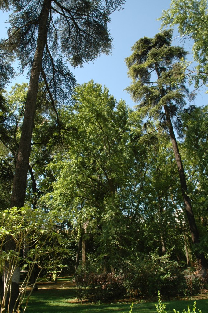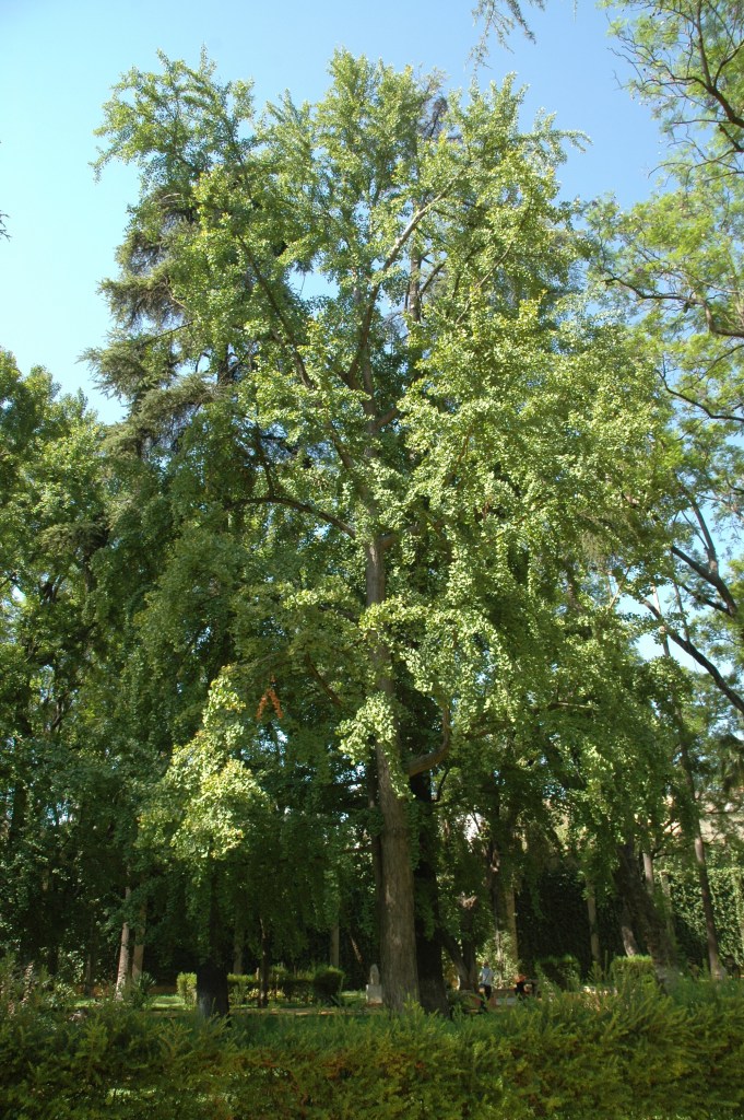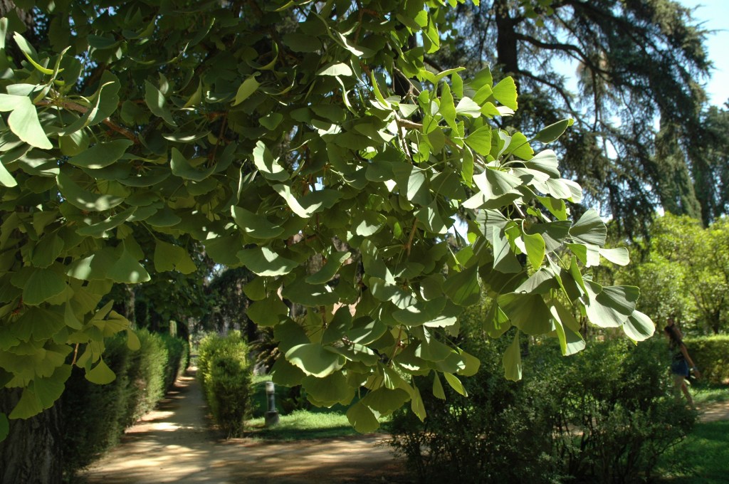 Ginkgo biloba, gingko, árbol de los cuarenta escudos o nogal del Japón es un árbol único en el mundo, sin parientes vivos. La especie Ginkgo biloba constituye uno de los mejores ejemplos de relicto o fósil viviente conocidos y existe hace 250 millones de años.Es un arbol caducifolio de porte mediano, puede alcanzar 35 m de altura, con copa estrecha, algo piramidal y formada por uno o varios troncos.La mejor representacion en la ciudad esta en estos jardines,medioambientalmente protegidos por la masa arbórea del jardín Inglés se desarrollan magnificamente.