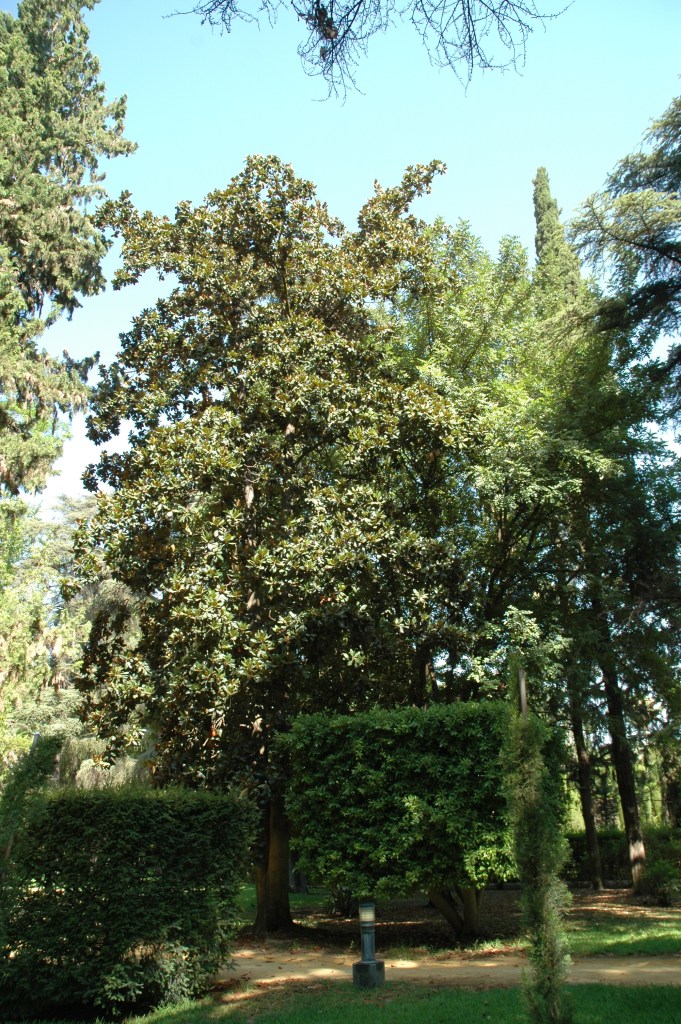 Magnolia grandiflora, magnolia común, magnolia grandiflora o, simplemente, magnolia, es una especie arbórea de hoja persistente perteneciente a la familia Magnoliaceae, es nativa del sureste de los Estados Unidos .Puede alcanzar alturas a más de 35 m de altura, se ramifica desde la base.Existen varios ejemplares en el jardín destacando por su antigüedad los dos existentes en el jardín de la Danza..
