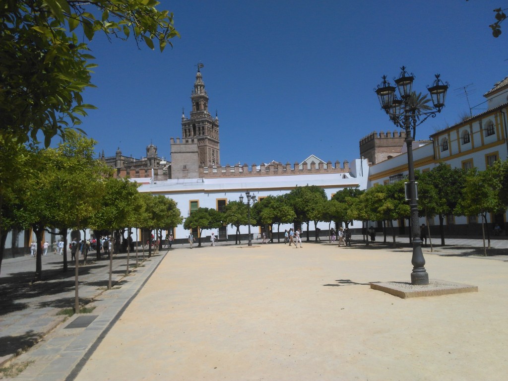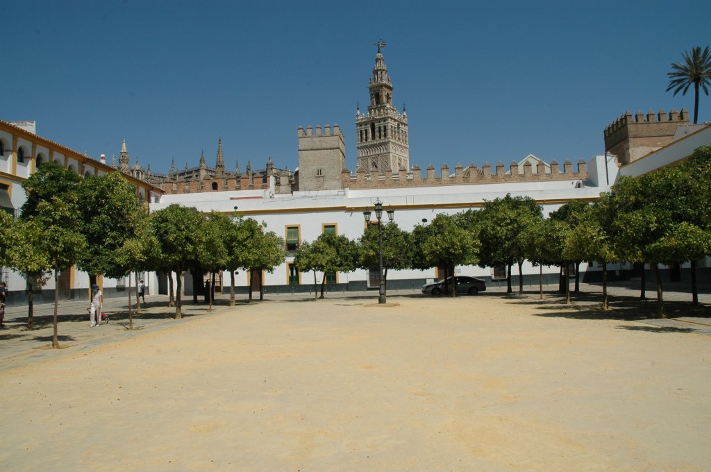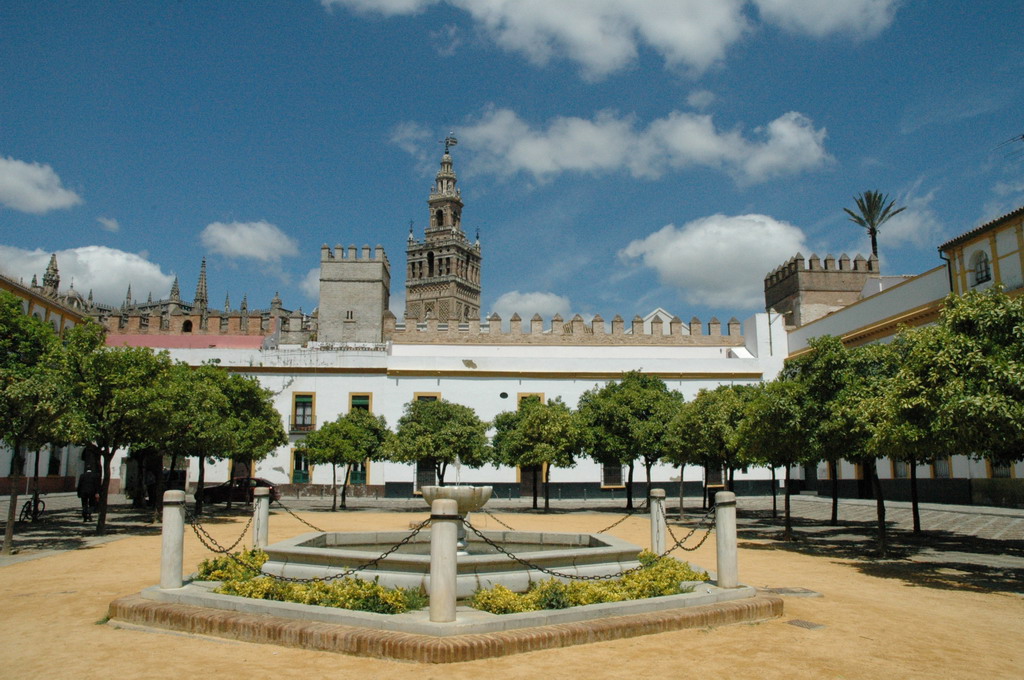 Tras los naranjos, en el interior, se extiende una superficie terriza –como probablemente estuvo todo el patio o plaza en sus comienzos- de albero compactado con una fuente en el centro. Esta fuente, que no es la primitiva, tiene mar hexagonal y taza alta con surtidor y es obra del escultor José Lafitta Díaz, autor también de la Plaza de la Virgen de los Reyes. La fuente se halla rodeada de una superficie de planta, también hexagonal, pavimentada con mármol y ligeramente levantada sobre el albero que presenta en sus vértices columnas marmóreas unidas por cadenas. Asimismo dispone de dos grandes farolas de fundición dentro de la superficie terriza que se alinean con la fuente en dirección este–oeste. “