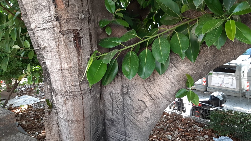Se trata de una variedad de Ficus que se puso de moda como planta de interior,el Ficus elastica “ Decora “ y que dado lo bonancible de los últimos inviernos ha vivido y vive en el exterior.Teme las heladas.