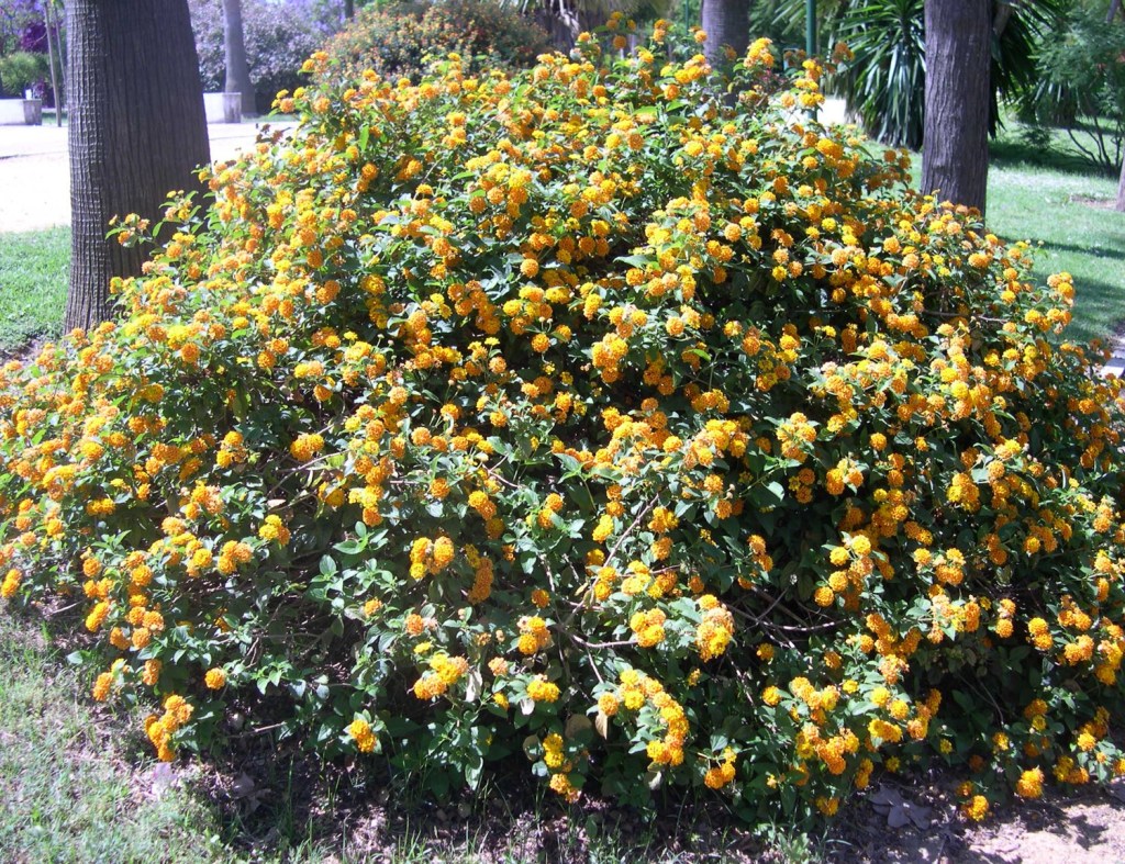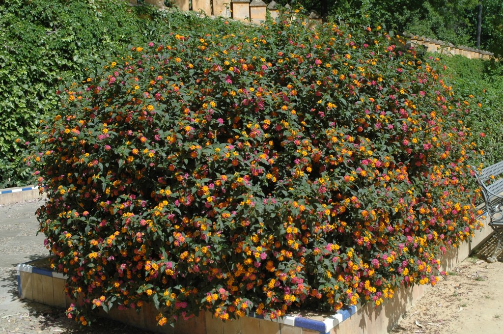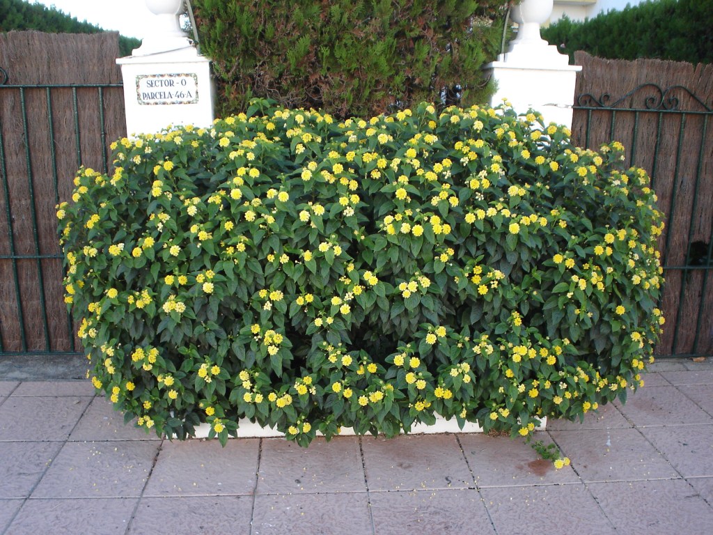 La lantana común es la más cultivada de todas las espècies de lantana y la más invasiva, aunque se ha vuelto tan altamente hibridada pero no es raro encontrar verdaderas plantas de lantana común a la venta en viveros. Es un arbusto perenne, con un pequeño hábito erguido. Les gustan los climas cálidos y secos, donde actuarán como plantas perennes, aunque en climas más fríos, se pueden helar.. Las lantanas se cultivan principalmente por sus flores vivas, que florecen durante toda la temporada, proporcionando al jardín una abundancia de colores alegres. La lantana común presenta flores amarillas, rojas y anaranjadas, que florecen en racimos prolijos en el extremo de los tallos, que se elevan desde el follaje verde medio de la planta. Hay muchos otros colores disponibles que surgen de la creación de especies híbridas de lantana. Estas plantas prosperan en climas cálidos y, aunque puede plantarlas en su jardín en cualquier momento hágalo después de los ultimos frios si los hay, rara vez comienzan a crecer antes que el clima realmente se calienta. Después de plantar, riegue estas plantas generosamente, pero una vez establecidas, prefieren el suelo seco y son tolerantes a la sequía. Demasiada agua o demasiado fertilizante inhibirá la capacidad de la planta para florecer. Tenga cuidado al cultivar estas plantas en condiciones cálidas y húmedas, ya que pueden naturalizarse fácilmente y volverse problemáticas. De hecho, esta planta se considera una especie invasora como antes hemos indicado.. Podar la planta con regularidad ayudará a evitar que la situación se salga de control. La poda se logra mejor a principios de la primavera y durante el verano La lantana común se puede recortar a unos veinte centímetros del suelo y responderá bien. O si prefiere mantener algo de altura, elimine alrededor de un tercio del tamaño total de la planta. Eliminar las flores de la planta una vez que las flores se hayan desvanecido también contribuirá a prevenir que se salga del control.Hay que mantenerla a raya para que no se desmadre..