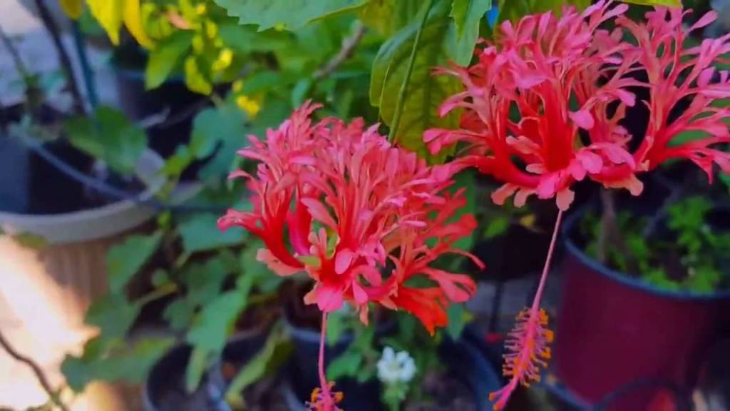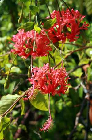Hibiscus schizopetalus, comúnmente llamado farolillo japonés o linterna japonesa, es originario de áreas tropicales en África oriental. Aunque no es originaria de Japón, sus flores caen de la ramificación de una manera que recuerda a las linternas japonesas, de ahí el nombre común.