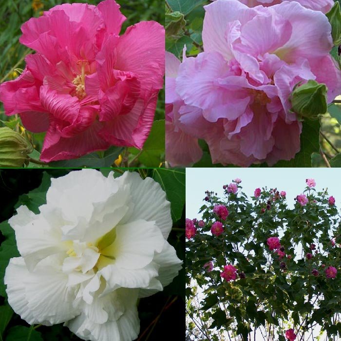 Hibiscus mutabilis es un gran arbusto o pequeño árbol de tallos múltiples en la familia Malvaceae de hoja caduca que crece hasta 3 m por 3 m , esta planta tiene un amplio follaje verde y flores vistosas. Sus hojas caen en el invierno dejando tras de sí unos tallos delgados y anodinos, pero cuando las hojas emergen en el verano son suavemente peludas imparten una textura gruesa que le da a la planta un llamativo atractivo ..Las flores se abren de color blanco y cambian de color durante un período de tres días hasta que adquieren un color rosa intenso y luego, cuando mueren, adquieren un tono «azul rosado» oscuro. Las flores de tres colores distintos aparecen en el arbusto simultáneamente. Hay disponibles variedades de flores simples y dobles, ambas con flores bastante grandes de 8-13 cm de ancho. Después de la floración, se forma una cápsula redonda y peluda que se seca y libera semillas difusas, un rasgo que inspiró el nombre común de una de las plantas, el algodón rosa, ya que los cogollos se asemejan a la cápsula de ese famoso miembro de la familia de los hibiscos