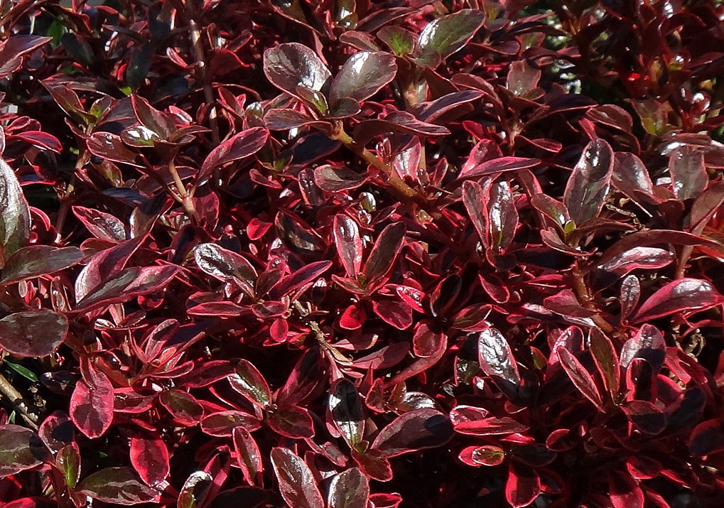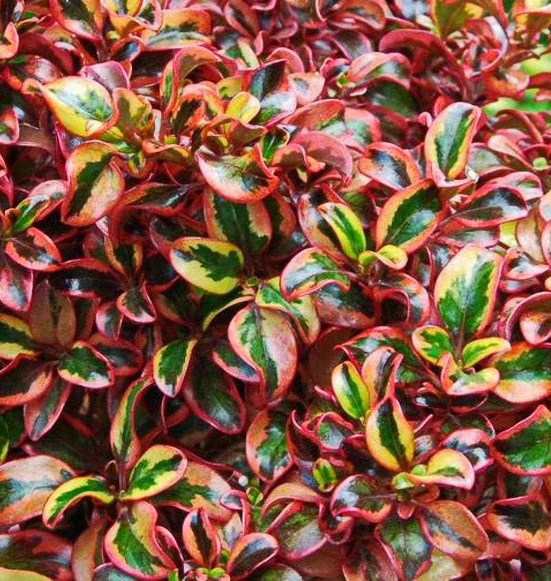 Coprosma repens ‘Pacific Sunset’ ™ tiene una hoja brillante en forma de ola que consta de un centro rojo vivo contra un margen marrón burdeos / chocolate. Es impresionante para usar en macetas o en el jardín y funciona bien en plantaciones masivas. La altura máxima es de aproximadamente 1 m. El color es más intenso en otoño e invierno, ¡un verdadero revuelo!
