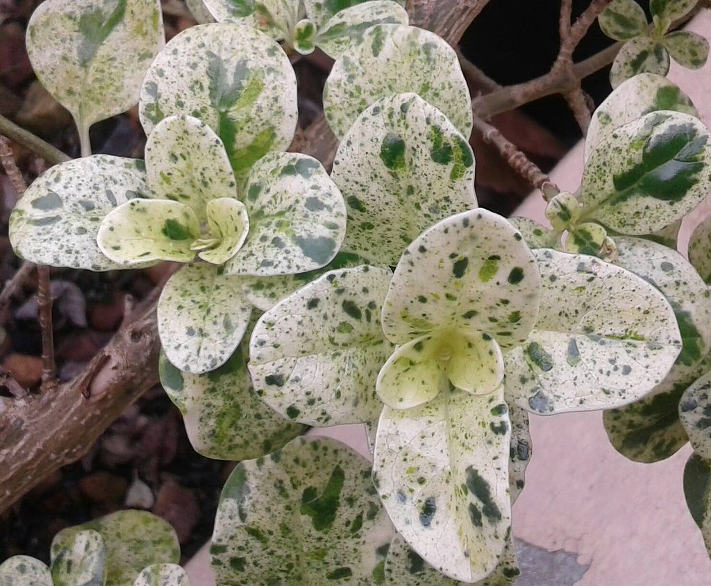 Coprosma repens ‘Marble Chips’ tiene follaje con márgenes irregulares. Estos márgenes se presentan en color blanco cremoso y las hojas suelen tener manchas de verde sobre blanco. Las astillas de mármol se clasifican como un arbusto grande y pueden crecer hasta 2 m de altura, formando un arbusto grande y brillante, sin embargo, se pueden recortar fácilmente a un tamaño más controlable.