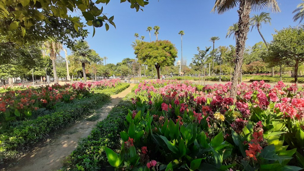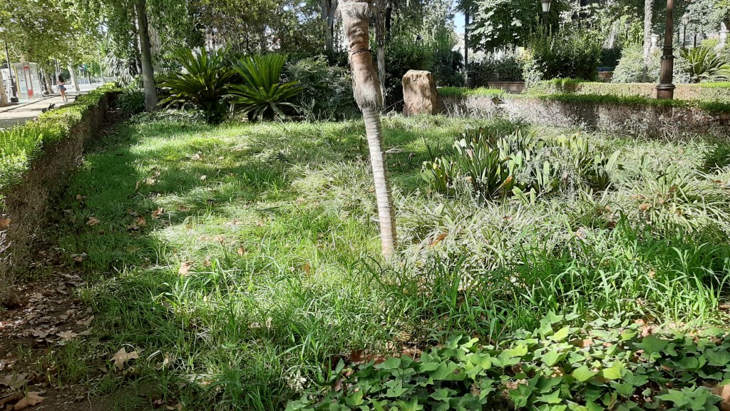 Parque de Marís Luisa.-Plaza de America.- Cannas resistentes en parterres de juncia