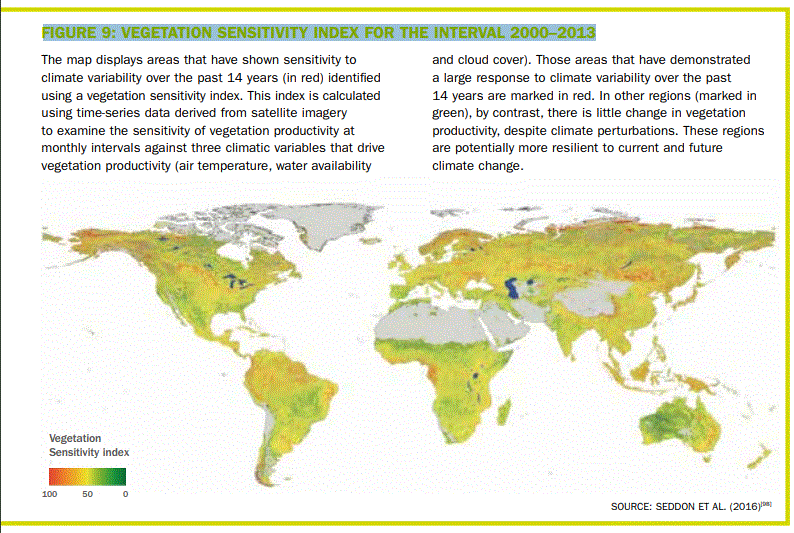 El mapa muestra áreas que han mostrado sensibilidad a la variabilidad climática durante los últimos 14 años (en rojo) identificadas mediante un índice de sensibilidad de la vegetación. Este índice se calcula utilizando datos de series de tiempo derivados de imágenes de satélite para examinar la sensibilidad de la productividad de la vegetación a intervalos mensuales frente a tres variables climáticas que impulsan la productividad de la vegetación (temperatura del aire, disponibilidad de agua y cobertura de nubes). Las áreas que han demostrado una gran respuesta a la variabilidad climática durante los últimos 14 años están marcadas en rojo. En otras regiones (marcadas en verde), por el contrario, hay pocos cambios en la productividad de la vegetación, a pesar de las perturbaciones climáticas. Estas regiones son potencialmente más resistentes al cambio climático actual y futuro.