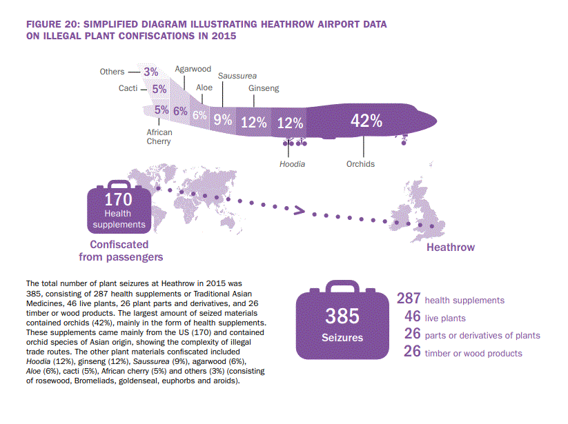 Es difícil encontrar datos precisos sobre el comercio ilegal de plantas, ya que la mayor parte del comercio ilegal indocumentado es «invisible» [204]. Cómo instantánea del comercio ilegal de plantas en el Reino Unido, obtuvimos los datos de 2015 sobre incautaciones en el aeropuerto de Heathrow (ver Figura 20), el aeropuerto internacional más transitado del mundo con más de 1000 vuelos diarios (http: //www.heathrow. Com ). Las plantas vivas, los derivados de plantas y los derivados de la madera representan más de la mitad de las incautaciones totales realizadas por los oficiales de la Fuerza Fronteriza del Reino Unido en Heathrow (G. Clarke, com. Pers.). Del total de 385 artículos vegetales y derivados de plantas incautados en 2015, el 74% fueron complementos para la salud clasificados como medicamentos tradicionales asiáticos, el 12% plantas vivas, el 7% derivados vegetales (cosméticos) y el 7% derivados de la madera. Los suplementos para la salud, las plantas vivas y los derivados de las plantas incautados estaban dominados por individuos o partes de la familia de las orquídeas, todos protegidos por la legislación CITES. Los suplementos para la salud se obtuvieron principalmente de especies asiáticas de Dendrobium, sin que se indique si el material de origen de esos productos procede de la naturaleza o de la reproducción artificial. Las incautaciones de derivados de la madera fueron principalmente madera de agar, el duramen resinoso infectado por hongos de las especies de Aquilaria y Gyrinops utilizadas en fragancias: todas las especies de estos dos géneros figuran en la CITES [180]. Estos datos demuestran la conveniencia de las orquídeas en todas sus formas y respaldan la necesidad de mantener la familia de las orquídeas en los apéndices de la CITES. El problema emergente actual de estos datos es la falta de trazabilidad de los productos de orquídeas una vez que se han recolectado y transpuesto a suplementos medicinales y cosméticos manufacturados. La creciente globalización del comercio, que significa que el origen y la fabricación de productos derivados de plantas incluidos en la CITES pueden estar en muchos continentes, es un problema real: la aplicación de la CITES debe ser sólida y estandarizada en todo el mundo para frenar el enorme comercio en el tráfico ilegal de vida silvestre (de plantas y animales), que actualmente se estima en un valor de entre 8.000 y 20.000 millones de euros cada año [181]