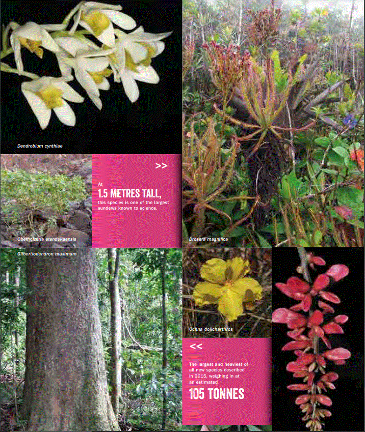 Algunos de los hallazgos más inusuales se describen a continuación. La más grande y pesada de todas las nuevas especies descritas en 2015, con un peso estimado de 105 toneladas, fue el máximo de Gilbertiodendron, uno de los ocho árboles de dosel de Gilbertiodendron leguminosos amenazados que se encuentran en la selva africana de Camerún-Congolia [7]. Con un crecimiento de 45 m de altura, con un tronco masivo de hasta 1,4 m de diámetro, este gigante en peligro crítico es endémico (es decir, único en una ubicación definida en) Gabón. Entre las otras especies de leguminosas nuevas para la ciencia se encuentra un árbol de Amburana del noreste de Brasil, que tiene semillas de color rojo brillante y savia que se usa localmente como jabón. Quizás el descubrimiento de leguminosas más emocionante de 2015 sea Oberholzeria etendekaensis, una suculenta shrublet, que no solo es una nueva especie sino también un nuevo género. Solo se conoce de una localidad con 30 individuos en el Centro Kaokoveld de Endemismo Vegetal, al noroeste de Namibia. Canavalia reflexiflora, una leguminosa papilionoide llamativa relacionada con la judía brasileña (un pariente silvestre del cultivo), también se describió en 2015. En lugar de ser descubierta en el campo, esta planta fue reconocida por primera vez por un investigador brasileño que estaba examinando especímenes en el herbario de Kew.. El trabajo de campo posterior reveló que esta rara especie ya no sobrevive en el lugar donde fue recolectada originalmente. Sin embargo, persiste en otra zona de Minas Gerais, Brasil, en un sitio sujeto a protección ambiental pero amenazado por el cultivo del café. Sus flores rojas con un estándar reflejado (pétalo) de longitud similar a los pétalos del ala y la quilla sugirieron que la especie es polinizada por colibrí, a diferencia de las otras especies de Canavalia, que son polinizadas por abejas. Las observaciones de campo lo han corroborado recientemente. De las selvas tropicales del sudeste asiático, se han identificado y publicado seis nuevas especies de lianas, arbustos y árboles de la familia de las prímula (Primulaceae), pertenecientes a los géneros Embelia, Maesa y Systellantha. También se han descrito cinco nuevos parientes de chirimoya y ylangylang de los géneros Alphonsea, Artabotrys, Meiogyne y Monoon, principalmente de Malasia e Indonesia. .