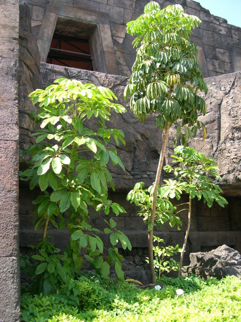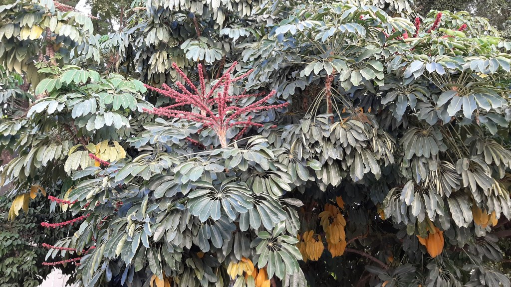 Schefflera actinophylla (antes Brassaia actinophylla y Tupidanthus calyptratus) Nombre común.-: Árbol paraguas, árbol pulpo, amate