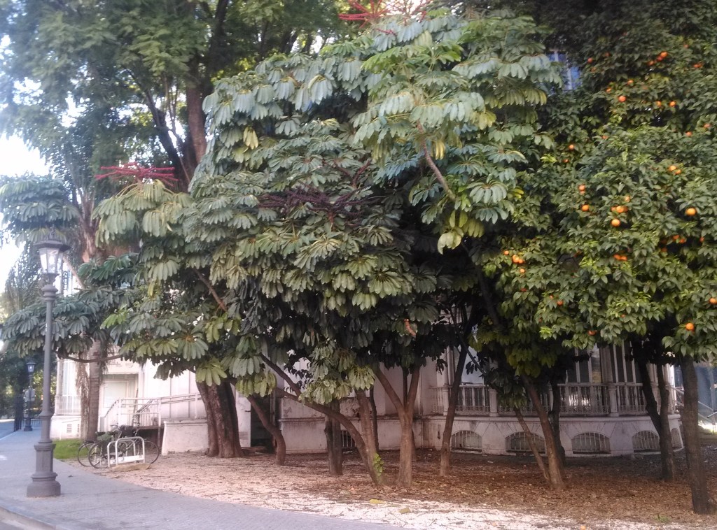 En Sevilla, el árbol paraguas debe protegerse de la luz solar total. Crece mejor en exposiciones al sol filtradas o protegidas de al menos 40% a 60% de exclusión de luz a sombra completa; de lo contrario, no solo tolera sino que de hecho prospera a pleno sol en los climas
