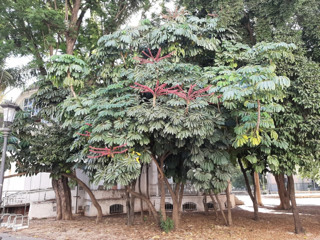 Flores y frutos: las flores son espigas de color rojo brillante de hasta 20 racimos agrupados que miden cada uno hasta 125 cm de largo. Las flores del árbol paraguas se ven en sitios de cultivo al aire libre durante los meses de otoño y invierno; las frutos son raros aquí en Sevilla.