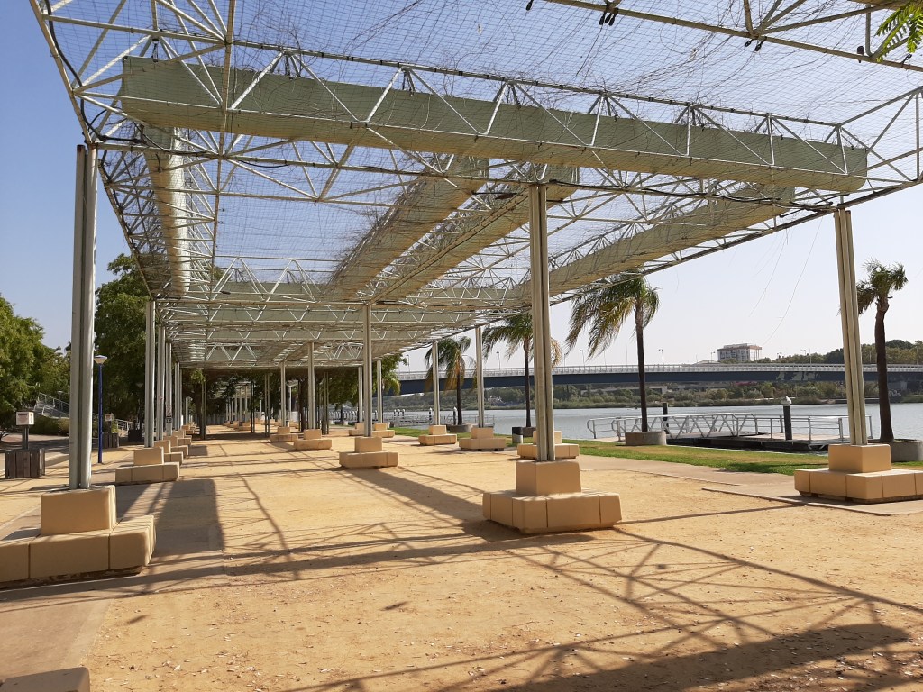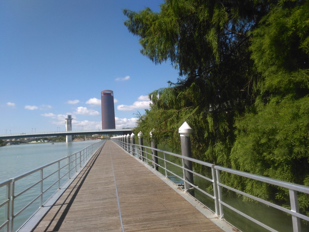 La pasarela fluvial es una estructura flotante de 400 metros de longitud que discurre paralela a la orilla de la Dársena del Guadalquivir. Es de uso exclusivamente peatonal. ( CERRADA DESDE HACE TIEMPO POR ROBOS Y VANDALISMO )