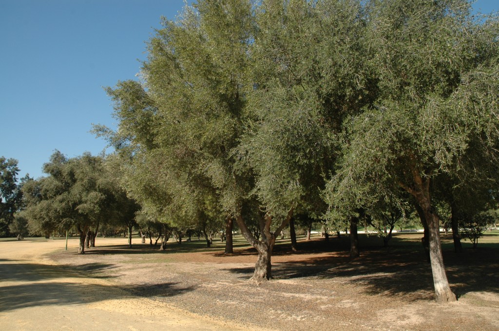 Olea europea var. silvestres .-Acebuches y olivos. Ceratonia siliqua .-Algarrobos, Quercus ilex .-encina,. Quercus suber .-Alcornoques.-Pinus pinea .-Pinos piñoneros, Acacia karoo.-Acacia horrida y Acacia cyanophylla .-mimosa’Casuarina stricta.- Casuarina y Tamarix gallica.-Taraje