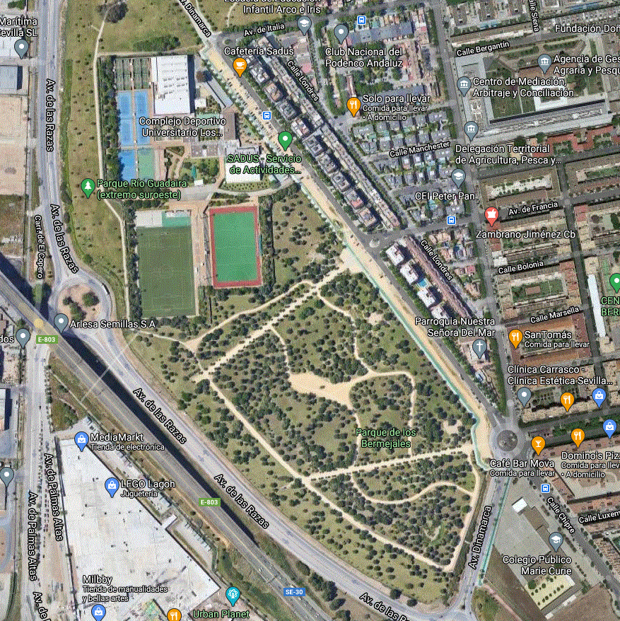 El Parque de los Bermejales está situado el final de la Avenida de Alemania (entre ésta y la vía de acceso desde la ronda de circunvalación SE 30, el Puente del Quinto Centenario y la Avenida de la Raza) es un buen ejemplo de restauración de espacios degradados para uso público que ahora después de catorce años de su inauguración está dando sus beneficios medioambientales.