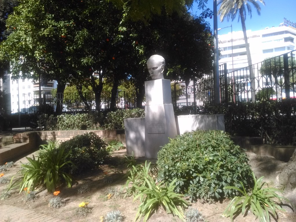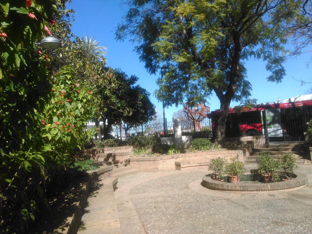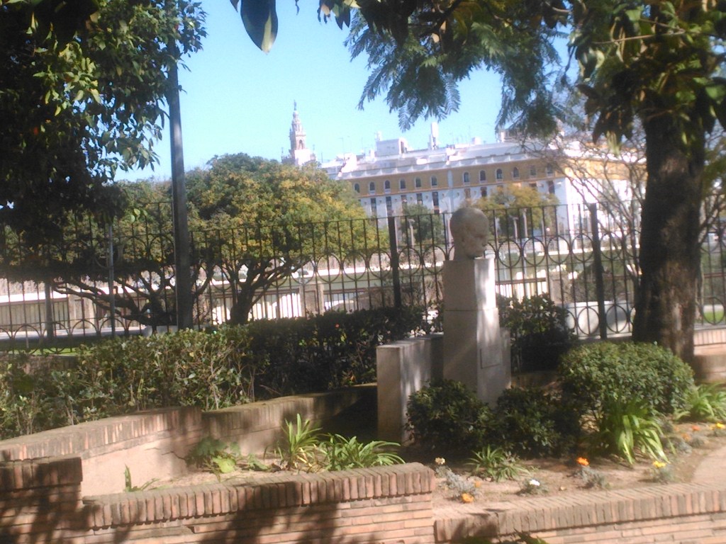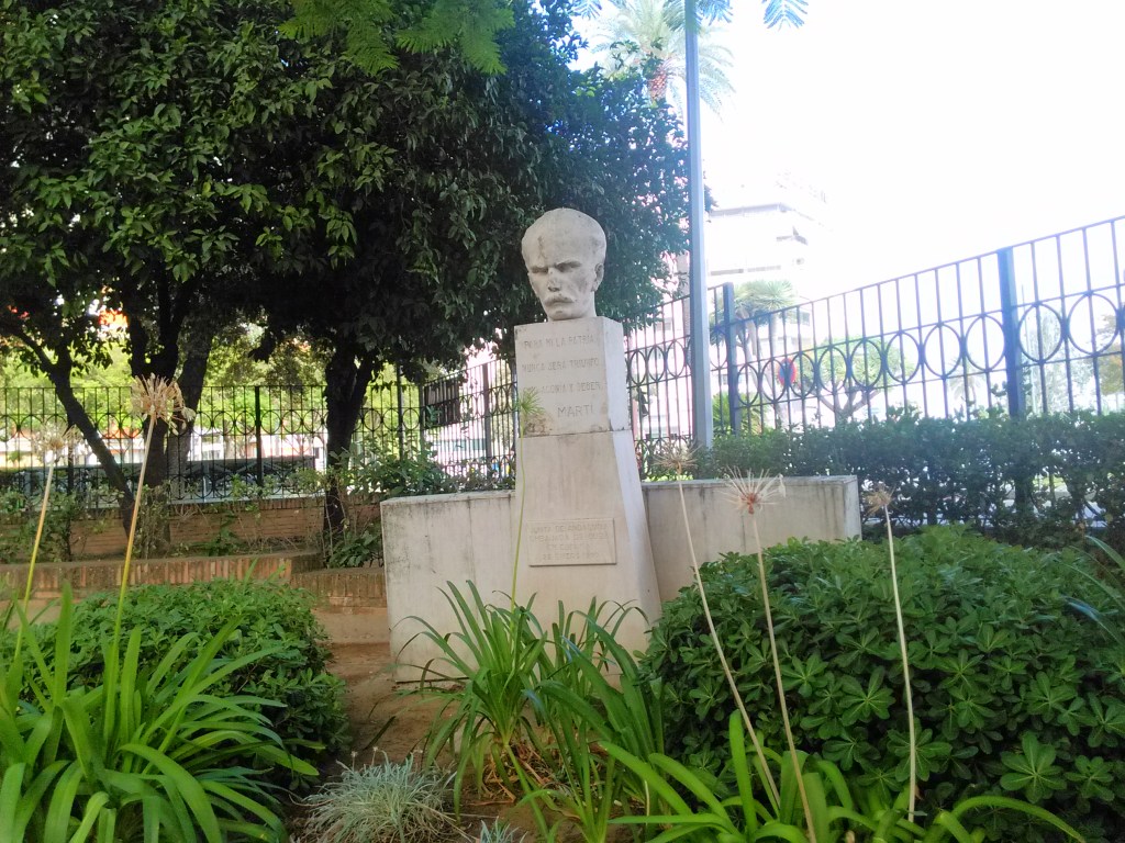 Plantados con posterioridad unos dragos de canarias.-Dracaena drago ,los de mejor porte que se dejan ver en la capital andaluza, confieren a la plaza un aire caribeño muy apropiado y en el jardincillo de entrada ahora cerrado, se coloca un busto de José Martí, escritor y político de origen cubano. , pensador, periodista, filósofo y poeta cubano, creador del Partido Revolucionario Cubano.
