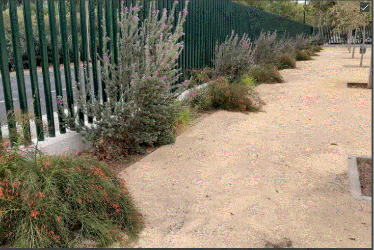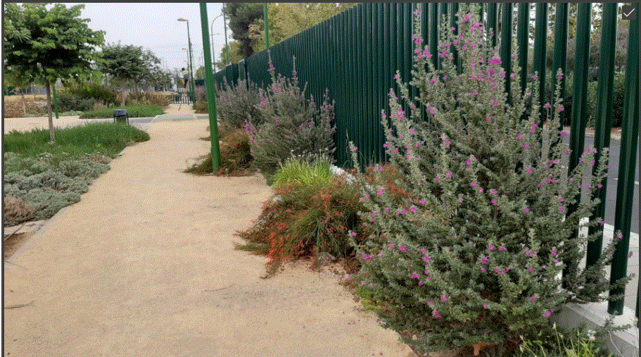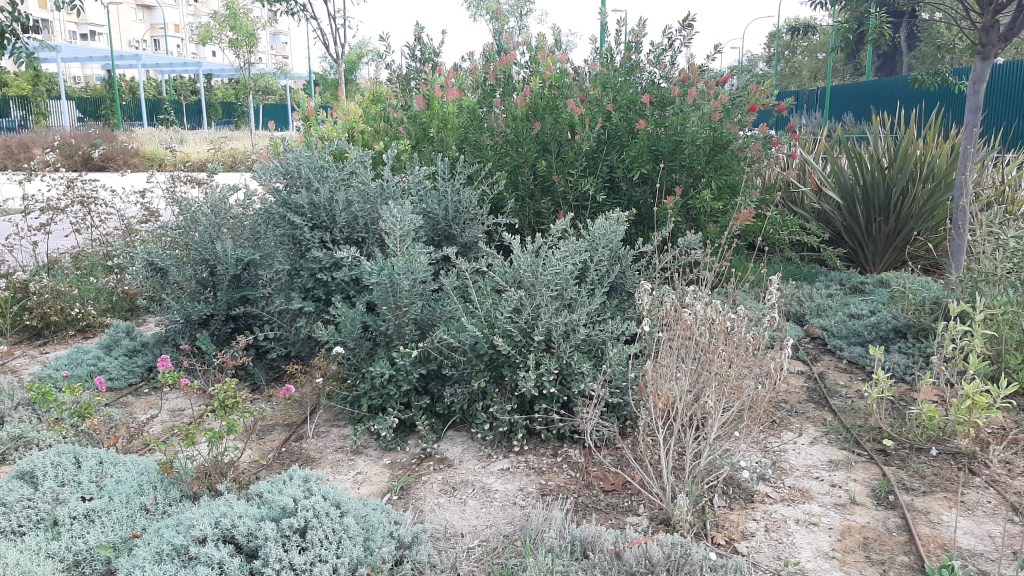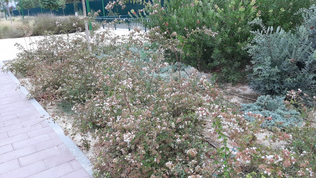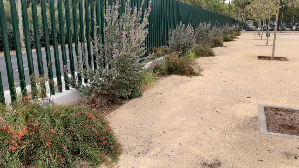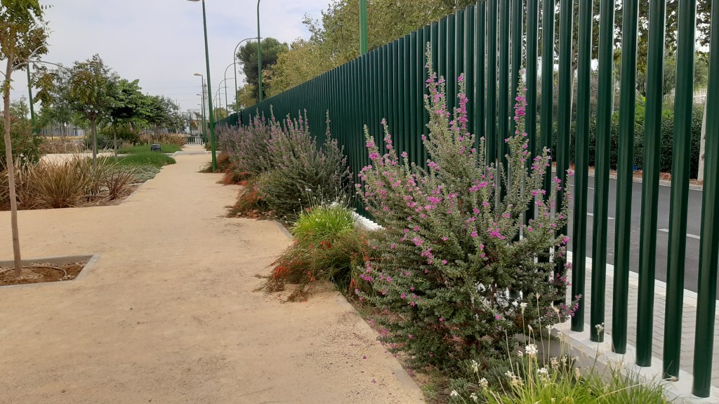 En el arriate junto al cerramiento por la Avda. Kansas City podemos ver Ajo de jardín.-Thulbalgia violácea., espaciados los cenizo.- Leucophyllum frutescens ,las lágrimas de Coral.-Russelia equisetiformis , entre las plantas que se aprecien.
