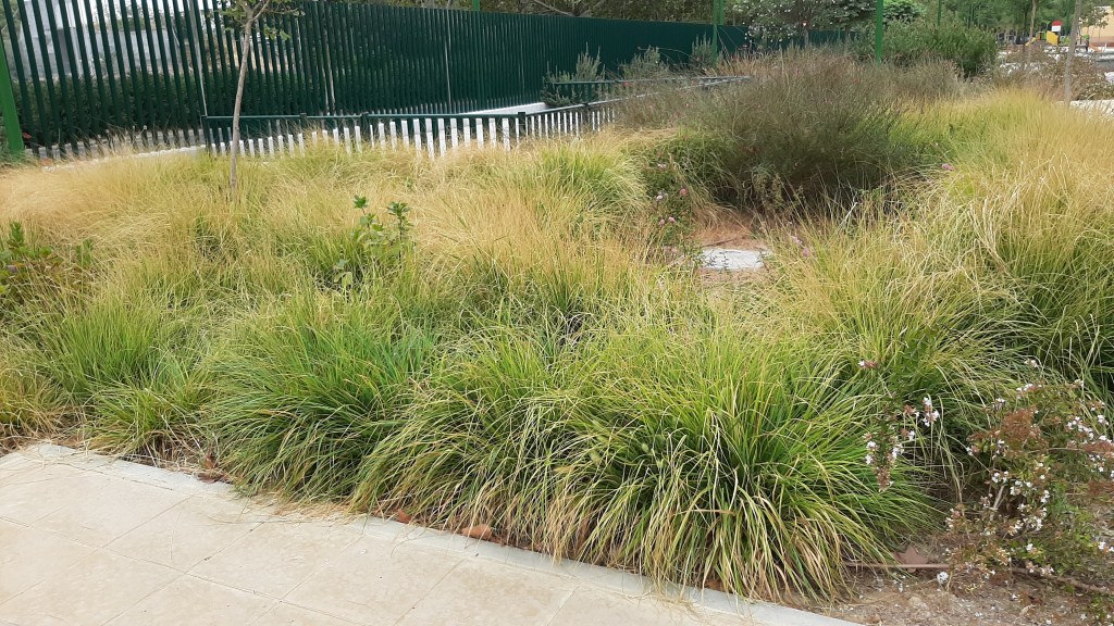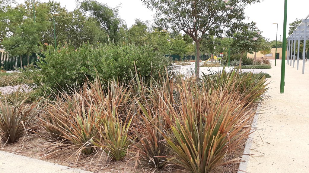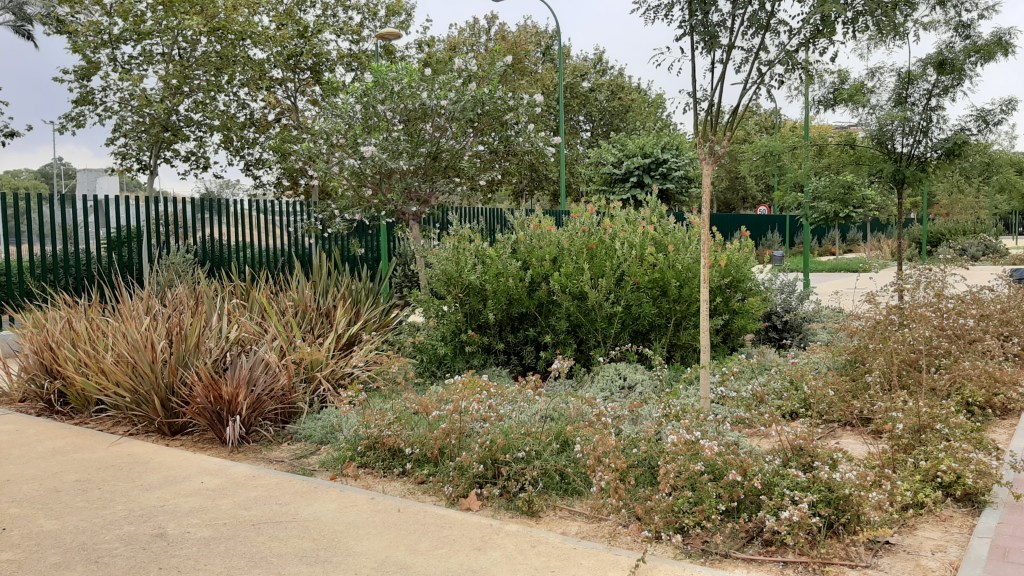 La vegetación de la nueva zona verde a la que todavía no ha entrado en el nomenclátor de los parques y jardines de la ciudad, la seguiremos llamando Parque de Tormentas de la Avda. Kansas City. está compuesta por: