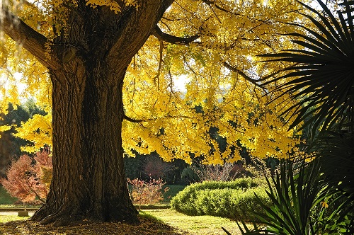 Valle del dragón.-,Un lago en el que en los bordes se exhiben plantas de porte pequeño destacando, un extraordinario ejemplar de Ginkgo biloba centenario de un gran porte .