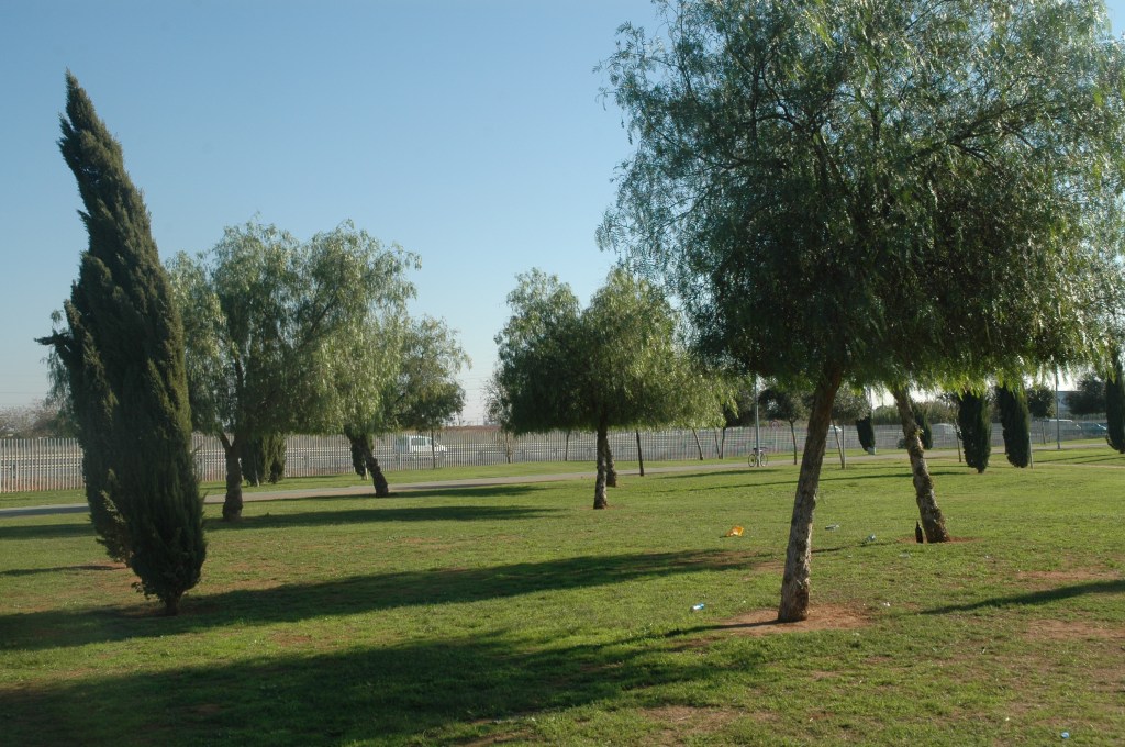 Un parque desangelado con amplia superficie verde que deberá ser replantado de arboles en sus paseos para poder disfrutarlo todo el año teniendo en cuenta la climatología local en la que durante ocho meses estamos buscando las sombras.
