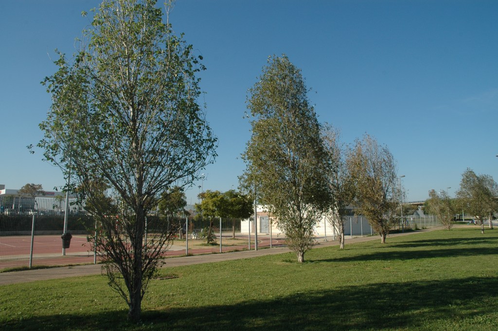 Aisladas unas falsas pimientas.-Schinus molle junto con fresnos.-Fraxinus angustifolia diseminados por el parque y chopos hoja de peral.-Populus simonii componen la escasa presencia arbórea en el mismo.
