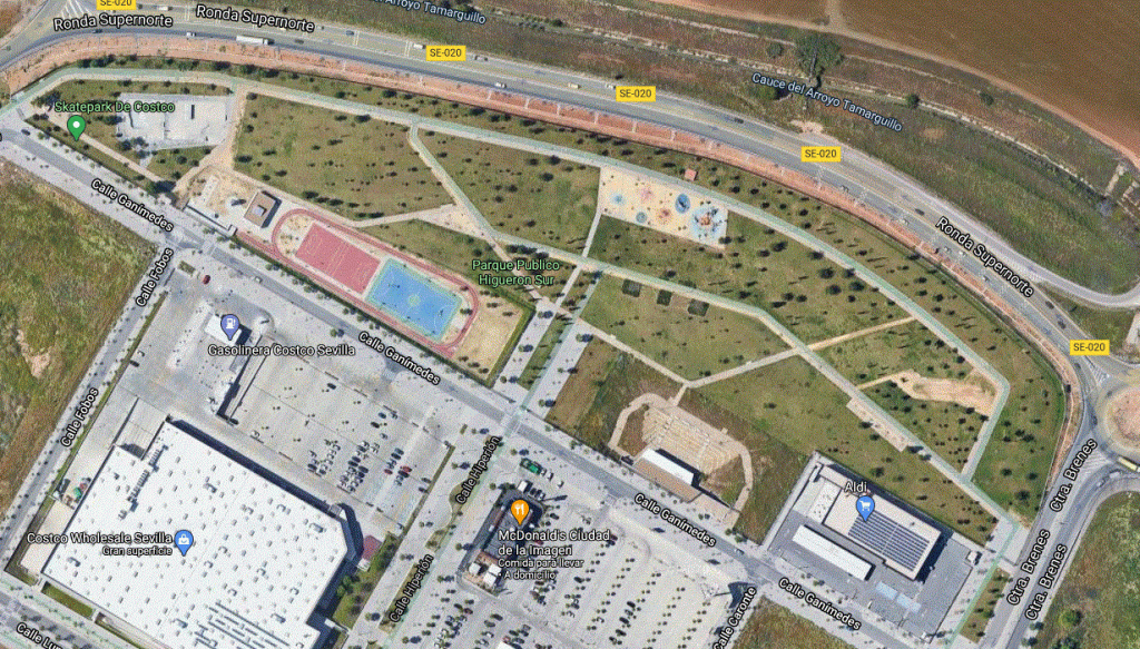 Después de varios años construido no conocía el parque que debió construirse en su día en el Higuerón Sur en el Distrito Norte de Sevilla dentro del complejo que la empresa Bogaris bajo el nombre inicial de la Ciudad de la Imagen promovía en la zona.. Se trata de un amplio espacio con más de 87.450 metros cuadrados de los cuales 50.000 son de jardines que incluye un auditorio bajo cota con cerramiento metálico más bien pobre, pistas deportivas parques infantiles y un gran skate-park para jóvenes adolescentes que hacen uso del patinete bancos de hormigón y algunas papeleras. Dotado de farolas para el alumbrado nocturno.