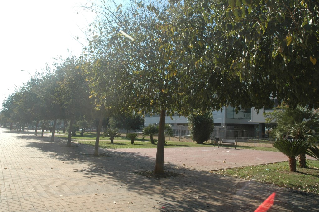 La vegetación arbórea consiste principalmente en una alineación longitudinal en toda la superficie de los parques de almeces.-Celtis australis como principal árbol de sombra, en ambos lados también longitudinalmente parterres de césped con plantación de arboles en algunos casos y palmáceas en otros.