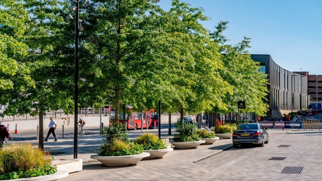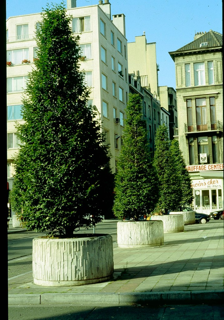 Jardineras / Contenedores.- Las jardineras o contenedores son una opción para sitios donde es imposible plantar debido a suelos pobres, falta de suelo, servicios públicos subterráneos u otros factores. Los macetones también se pueden utilizar con fines de diseño arquitectónico. Los macetones para árboles vienen en varias formas y tamaños y están hechas de plástico, fibra de vidrio, madera, cemento u otros materiales compuestos. Deben tener paredes gruesas, ser de un color claro y medir como mínimo 60 cms ,1´20 metros de profundidad son aconsejables con orificios de drenaje adecuados.