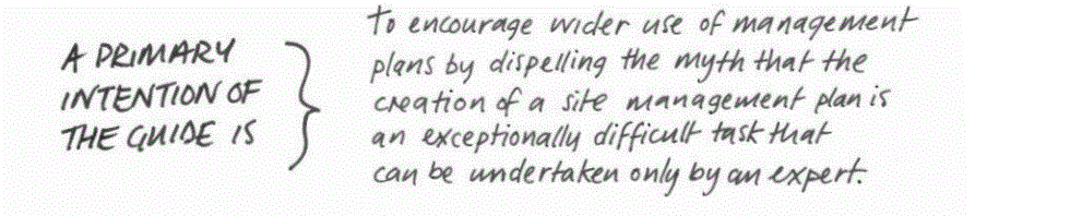 Otra intención es ilustrar el valor de la planificación de la gestión como un proceso en sí mismo. Por supuesto, algunos planes de manejo serán mejores que otros, pero en casi todos los casos, cualquier plan de manejo que haya sido razonablemente bien pensado será mejor que ninguno. Después de todo, la medida del éxito no es el plan en sí, sino el cambio que produce en el terreno y en la comunidad. Los resultados de las revisiones del plan de gestión y las entrevistas con los profesionales han sido de gran ayuda en el desarrollo de la guía y, cuando fue posible, se han utilizado ejemplos de estudios de casos para ilustrar puntos específicos.