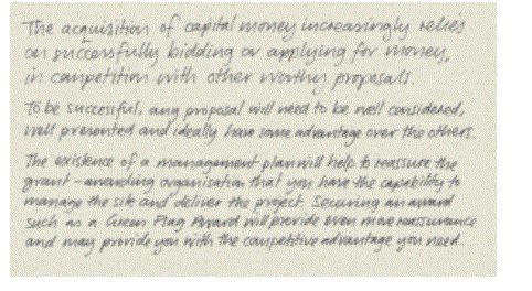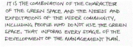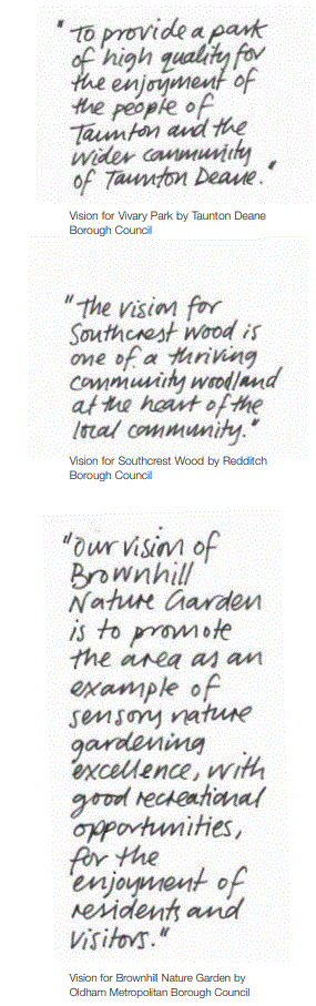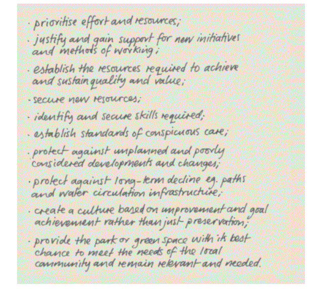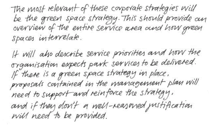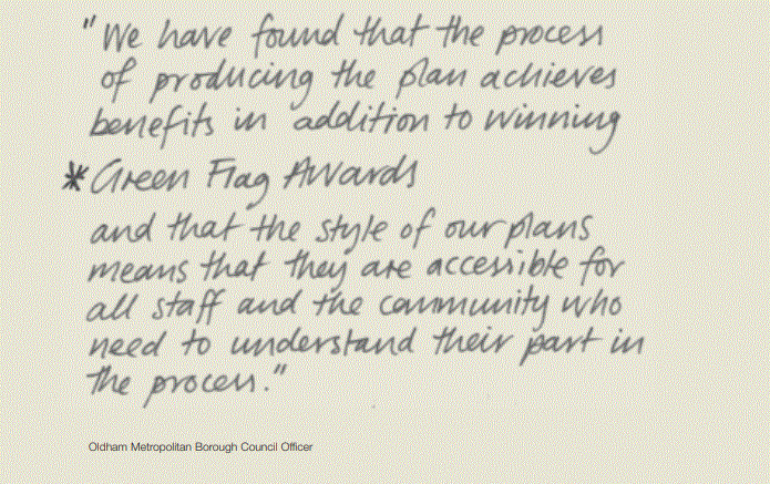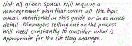 El gobierno también reconoce la contribución de los espacios verdes de calidad a la construcción de comunidades sostenibles y al cumplimiento de la agenda de habitabilidad. Las organizaciones involucradas en la producción de esta guía han intentado hacer recomendaciones que se ajustan a una amplia gama de circunstancias y aplicaciones, asegurando que las personas responsables de la gestión de parques y espacios verdes no tengan que producir varias versiones diferentes de su plan de gestión en función de su Uso previsto. Sin embargo, los gerentes deben ser conscientes de que estos diversos programas aún esperan que sus requisitos específicos se incorporen en un plan de manejo que se les presente. Por ejemplo, el plan de gestión de diez años del Heritage Lottery Fund (HLF) requerirá más énfasis en la estructura del personal y los recursos (ver anexo A), y los planes que respalden las entradas del Premio Bandera Verde deben hacer referencia precisa a los objetivos estratégicos más amplios del área (y así reducir la necesidad de enviar más documentación con la entrada del premio).