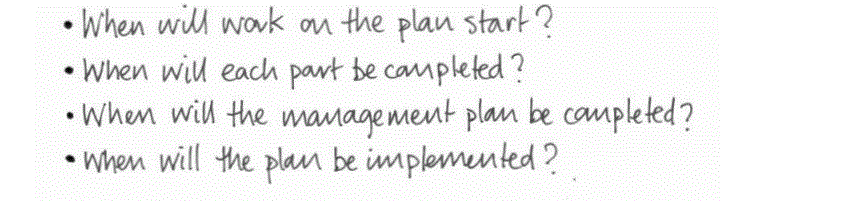 Cualquiera que sea el enfoque que se adopte, se recomienda que una persona asuma la responsabilidad general del plan de gestión. La primera etapa es redactar un resumen adecuado y garantizar la aprobación de las partes interesadas. Luego, para garantizar que se recopile la información correcta, que participen las personas adecuadas, que se cumplan los plazos y que los componentes del plan se unan para crear un todo coherente que sea sensible, fácil de leer y comprender y que cumpla con los objetivos originales. Idealmente, la persona que asume la responsabilidad debe ser parte del equipo que entrega el plan de acción y también debe participar o ser responsable del seguimiento y la revisión.