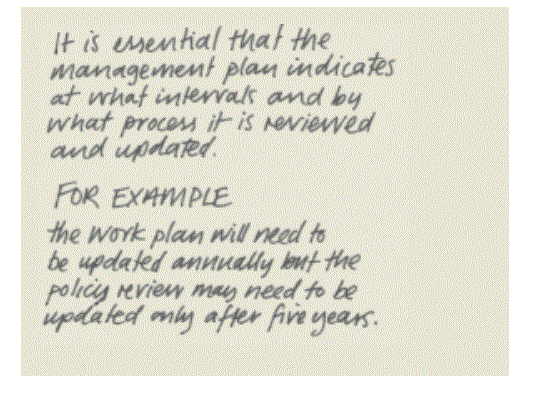 El plan de gestión debe identificar claramente qué componentes del plan se actualizarán y cuándo. Una forma útil de abordar esta sección es que el equipo involucrado en la producción del plan de gestión continúe reuniéndose trimestral o bianualmente para supervisar la entrega del plan de trabajo. Entonces será fácil producir el plan de trabajo del próximo año y también revisar sus objetivos.