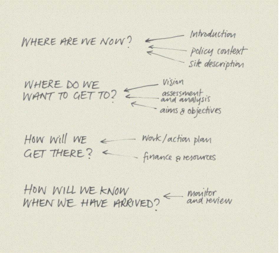 El plan de gestión de la conservación se produce antes del comienzo de cualquier obra y se centra en los requisitos de restauración y mejora de capital de un sitio. Proporciona la información detallada necesaria para justificar y probar la necesidad de inversión. Para que los solicitantes demuestren que tienen un conocimiento adecuado del activo, se espera que incluyan la siguiente información: