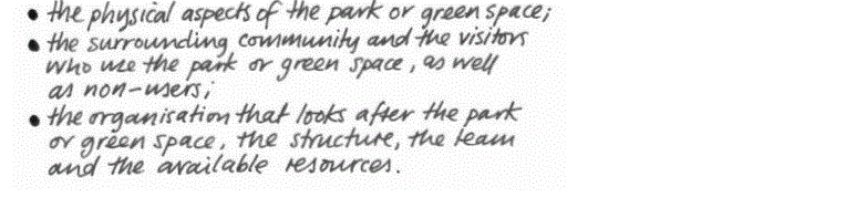 Aunque muchos espacios verdes tienen una característica dominante y son particularmente valorados por un aspecto como la conservación de la naturaleza, el paisaje patrimonial u oportunidades de recreación, esta guía toma como modelo un sitio que es valorado por una variedad de cualidades y facetas y todo tipo de servicios para diferentes usuarios.