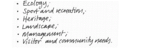 La palabra «comunidad» debe entenderse para incluir empresas, escuelas y universidades locales, así como a los residentes. Querrán saber cómo las propuestas del plan afectan el disfrute del sitio para ellos y su familia. Querrán saber si los aspectos particulares del sitio que más les importan serán retenidos, mejorados o empeorados por las propuestas del plan de gestión. Si sus aspectos favoritos del sitio están de alguna manera amenazados por el plan, requerirán una justificación clara y convincente para el cambio propuesto.